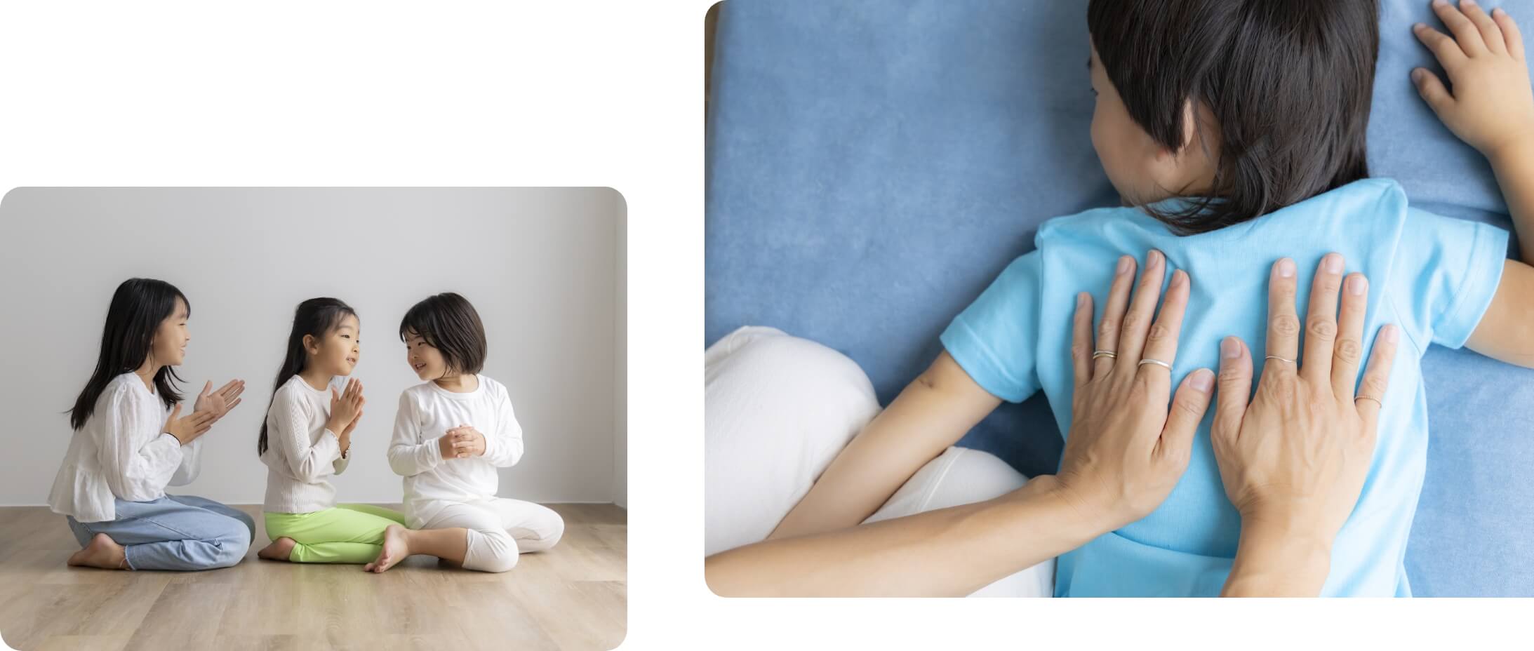 プレシャスキッズタッチとは、主に幼児期や学童期のお子さんを対象にした、親子やお友達同士で楽しめるタッチケアの考え方や方法です。